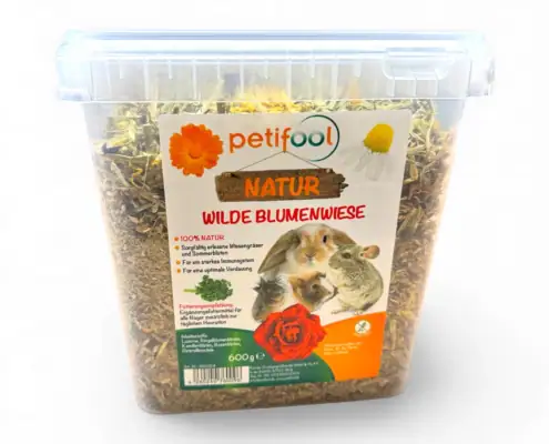 Das Ergänzungsfutter petifool Wilde Blumenwiese ist eine natürliche Mischung aus Wiesengräsern und aromatischen Sommerblüten, die von Kaninchen und Nagern gern gefressen wird. Die enthaltenen Kamillenblüten können Verdauung und Wohlbefinden unterstützen und machen die Mischung zu einem schmackhaften Leckerlie für zwischendurch.