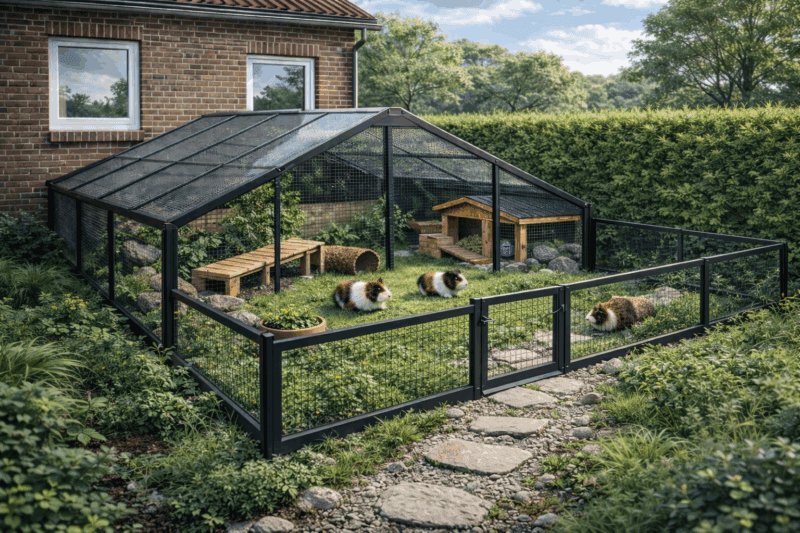 Ideale Außenhaltung für Meerschweinchen mit viel Platz und natürlichen Elementen.